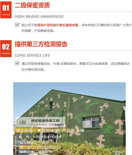 迷彩偽裝涂料漆、環保建材等領域,但外墻迷彩漆是一種特殊的涂料,主要用于提供防護和迷彩效果,具有耐候性強新產流程全程監控